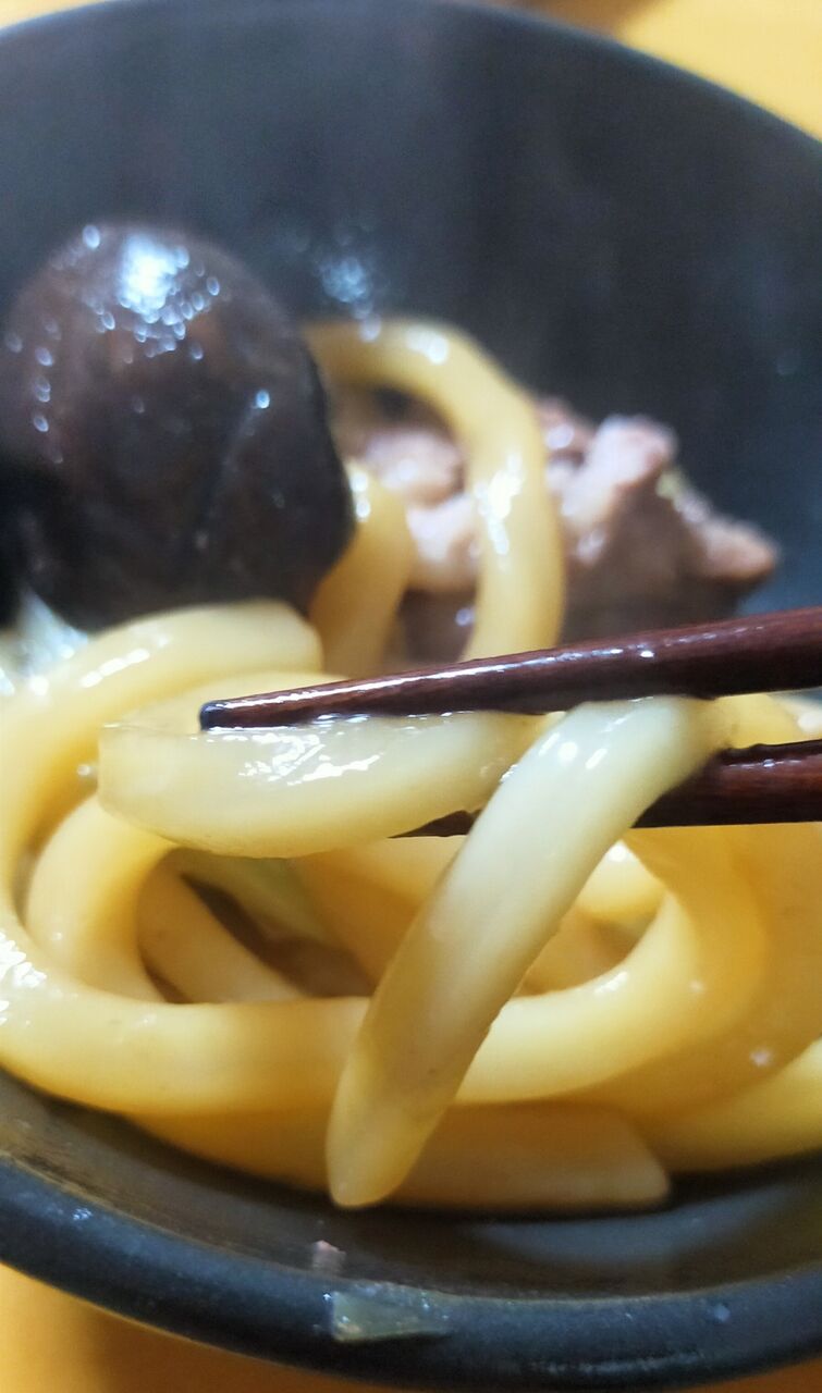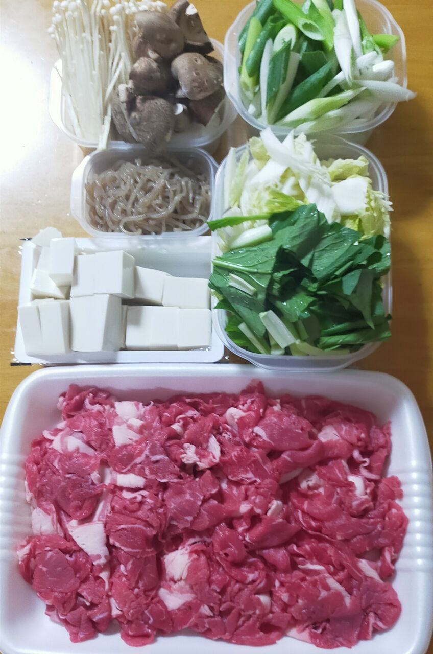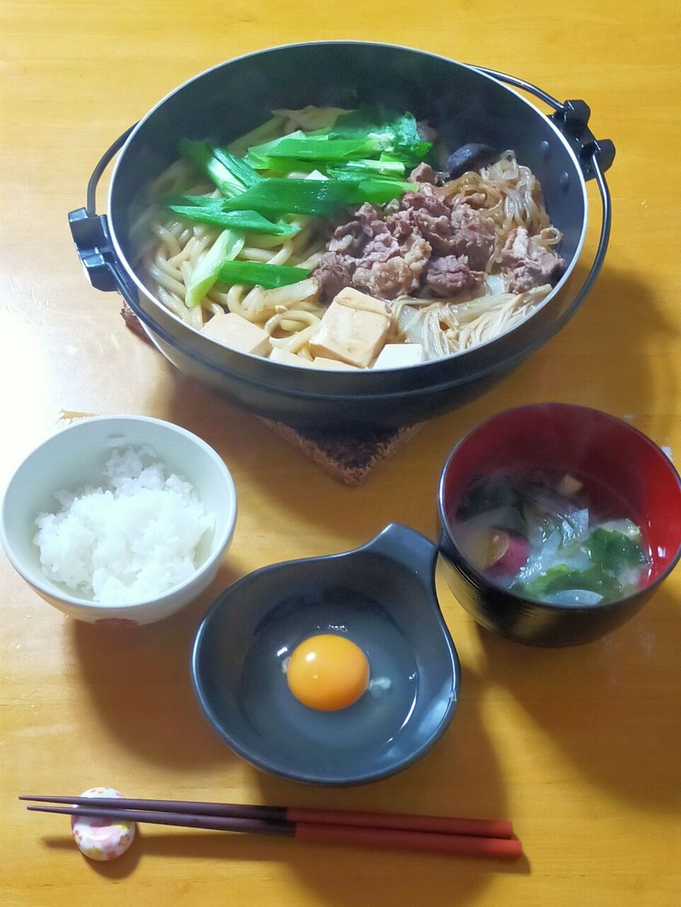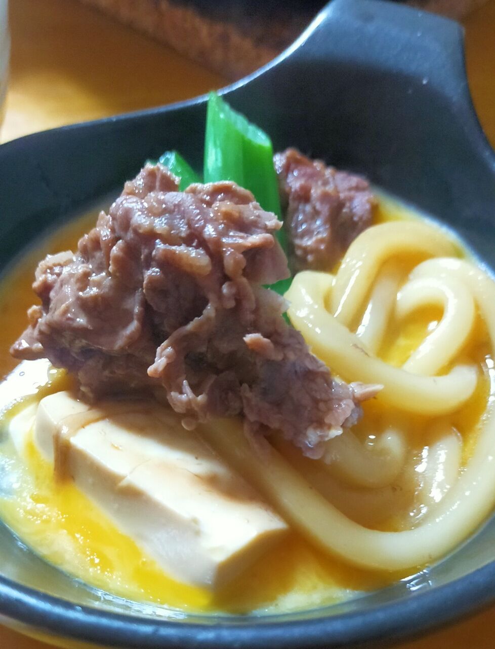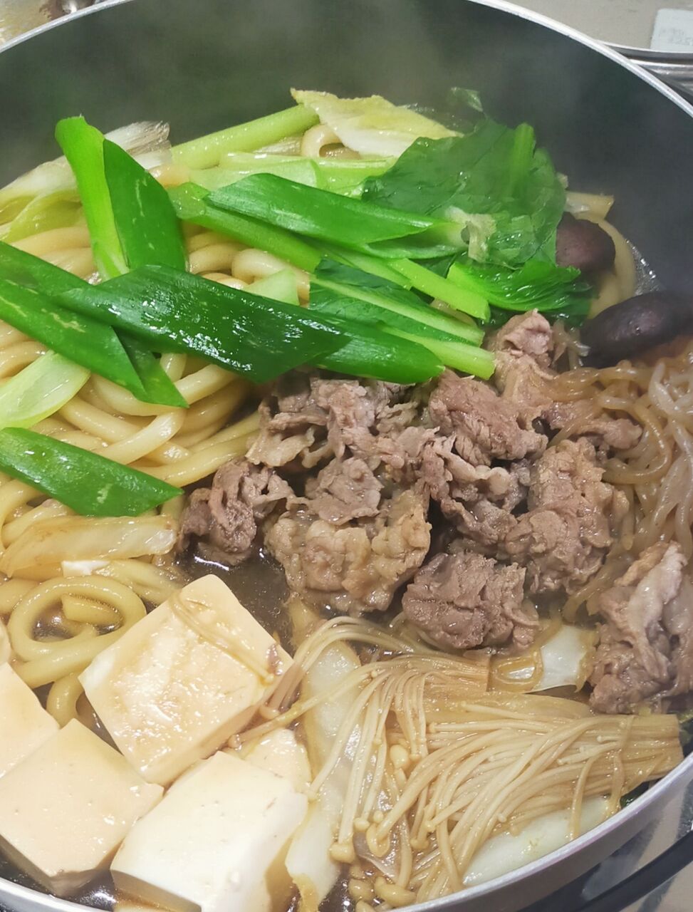 すき焼きの残った牛肉、糸こん、椎茸、白ネギを炒めて
