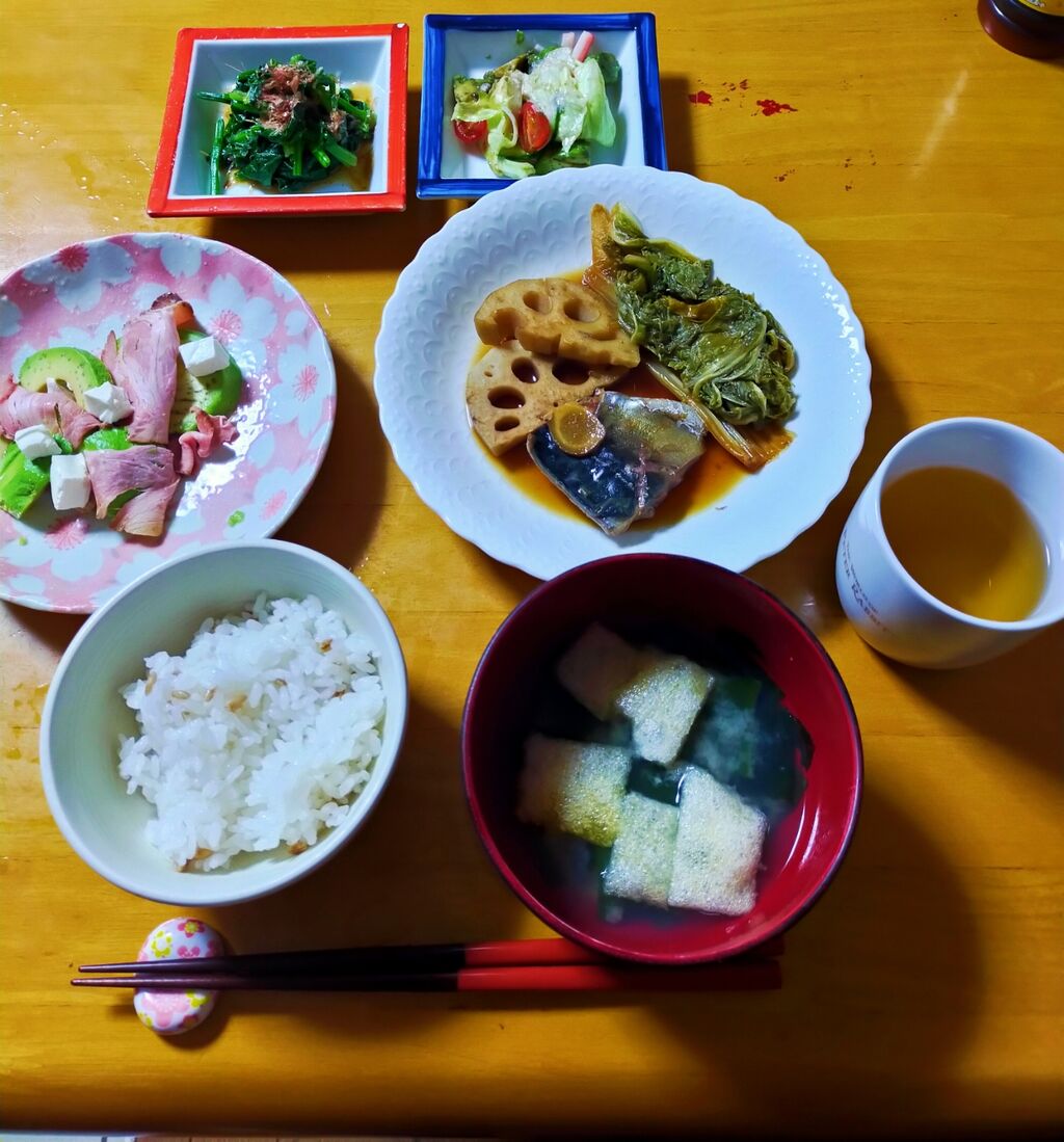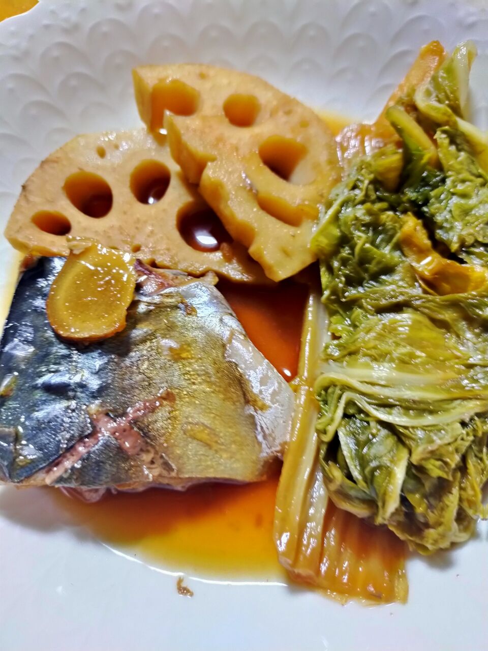鯖の煮付け、蓮根、オレンジ白菜も一緒に煮込む