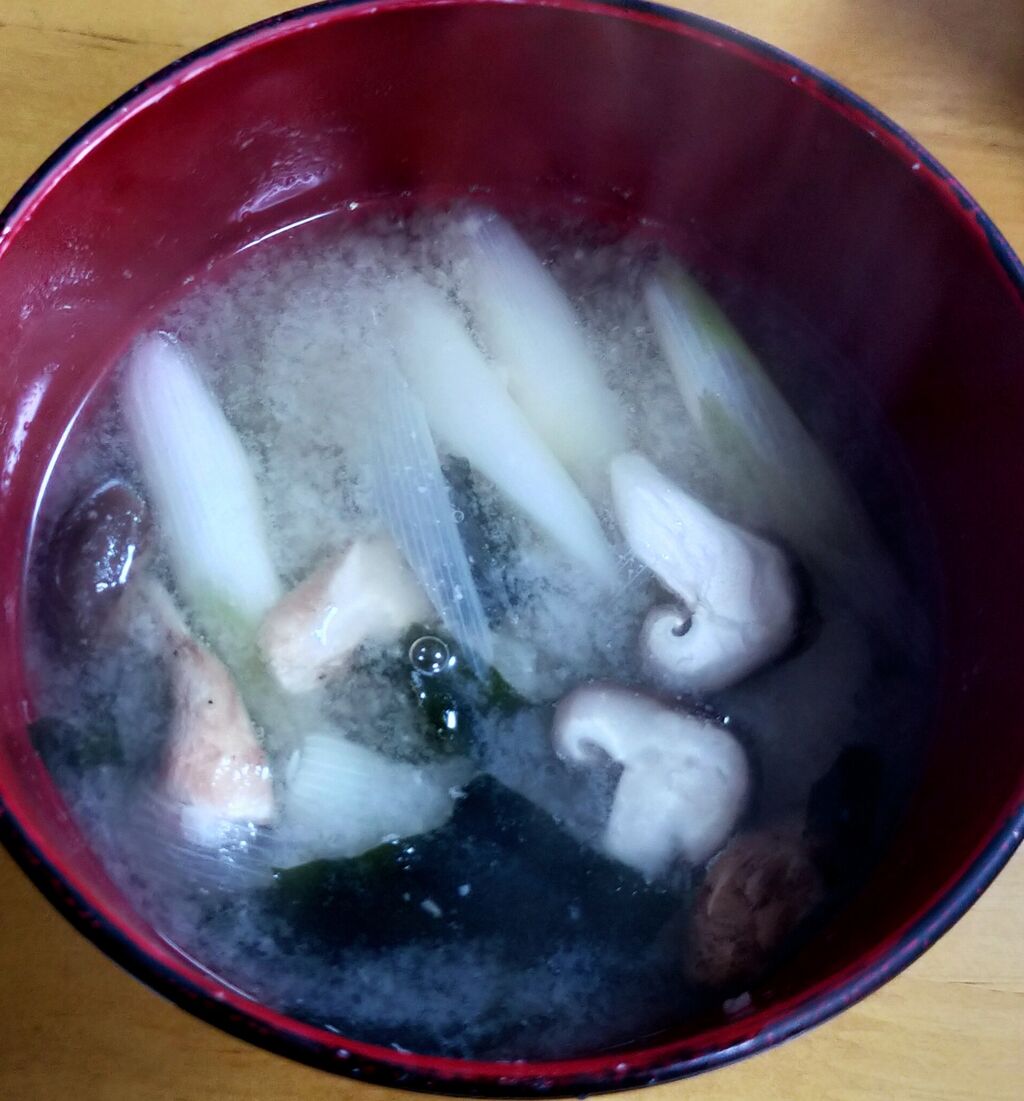 からの白ネギ、椎茸、ワカメ、揚げさんの味噌汁
