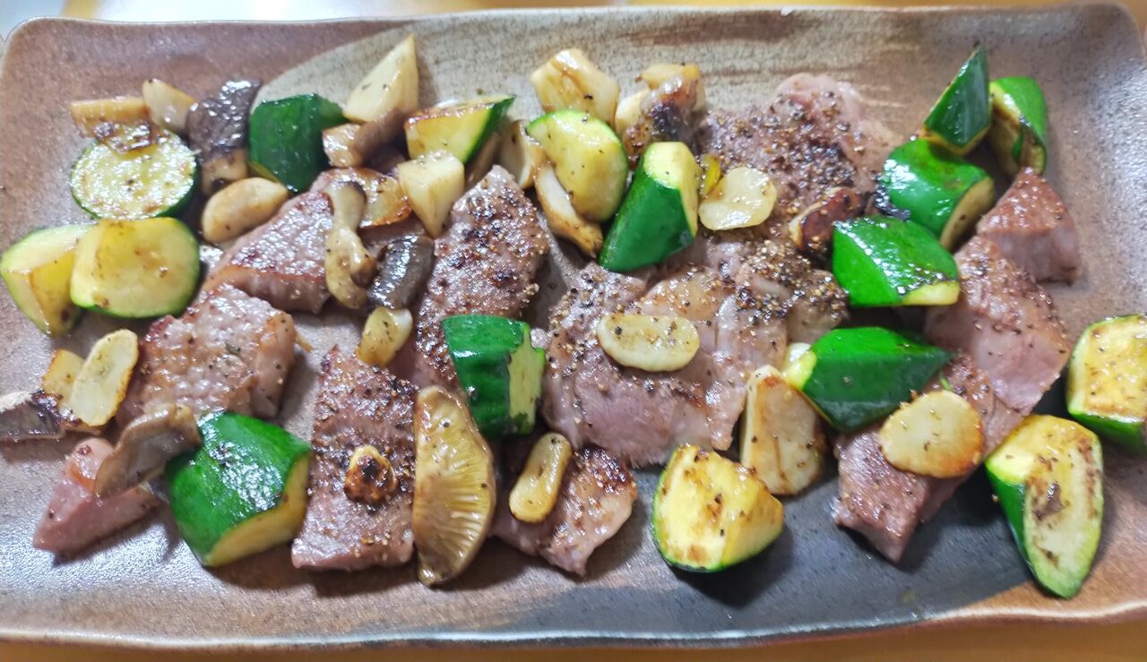 かさ増しのエリンギとズッキーニ お肉の油を吸って