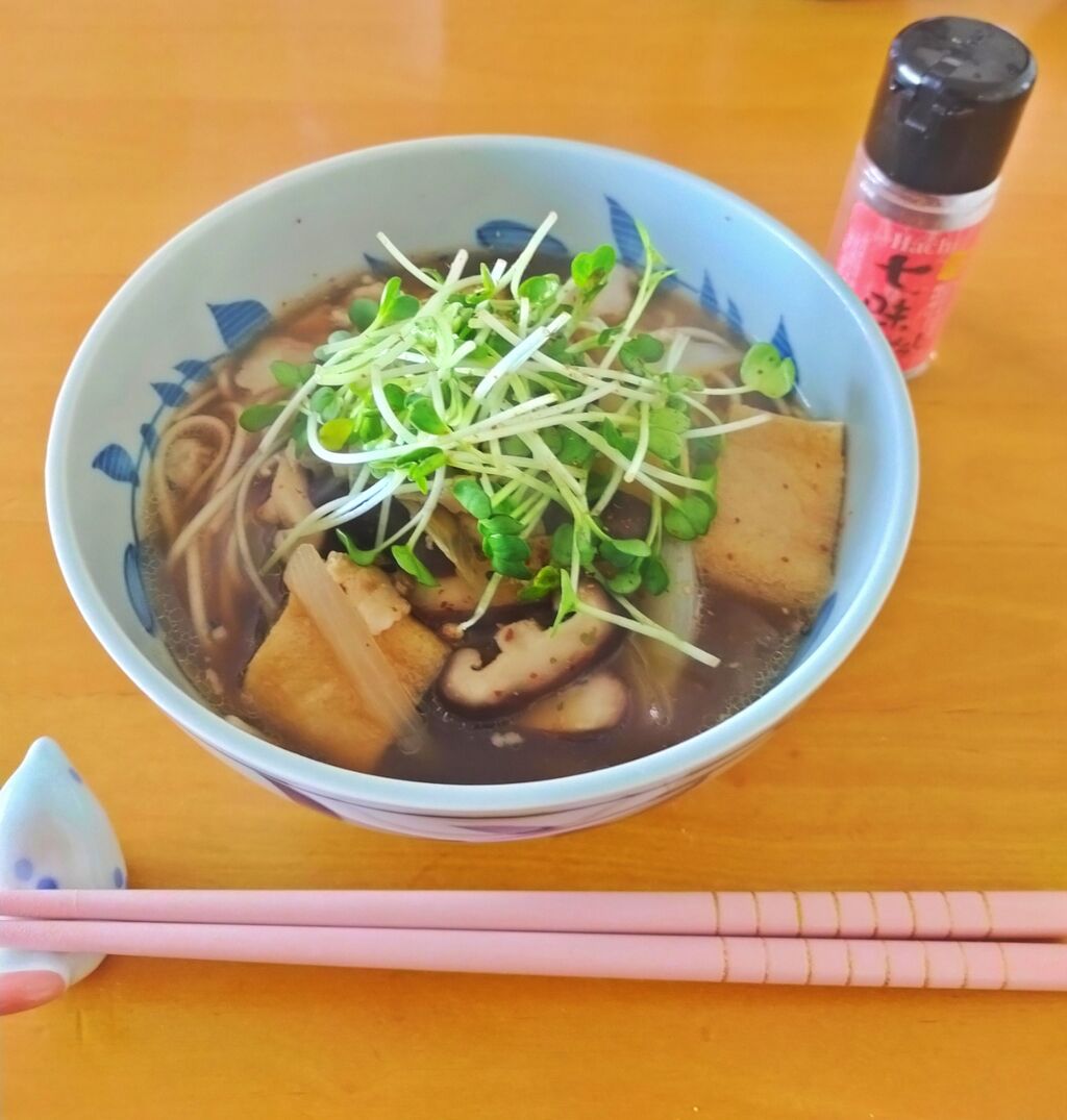 豚バラ、玉ねぎ🧅椎茸🍄を炒めて出汁をはって、薄揚げを足して、お蕎麦を作りました ぐぇ〜お腹一杯!