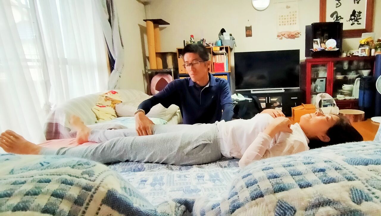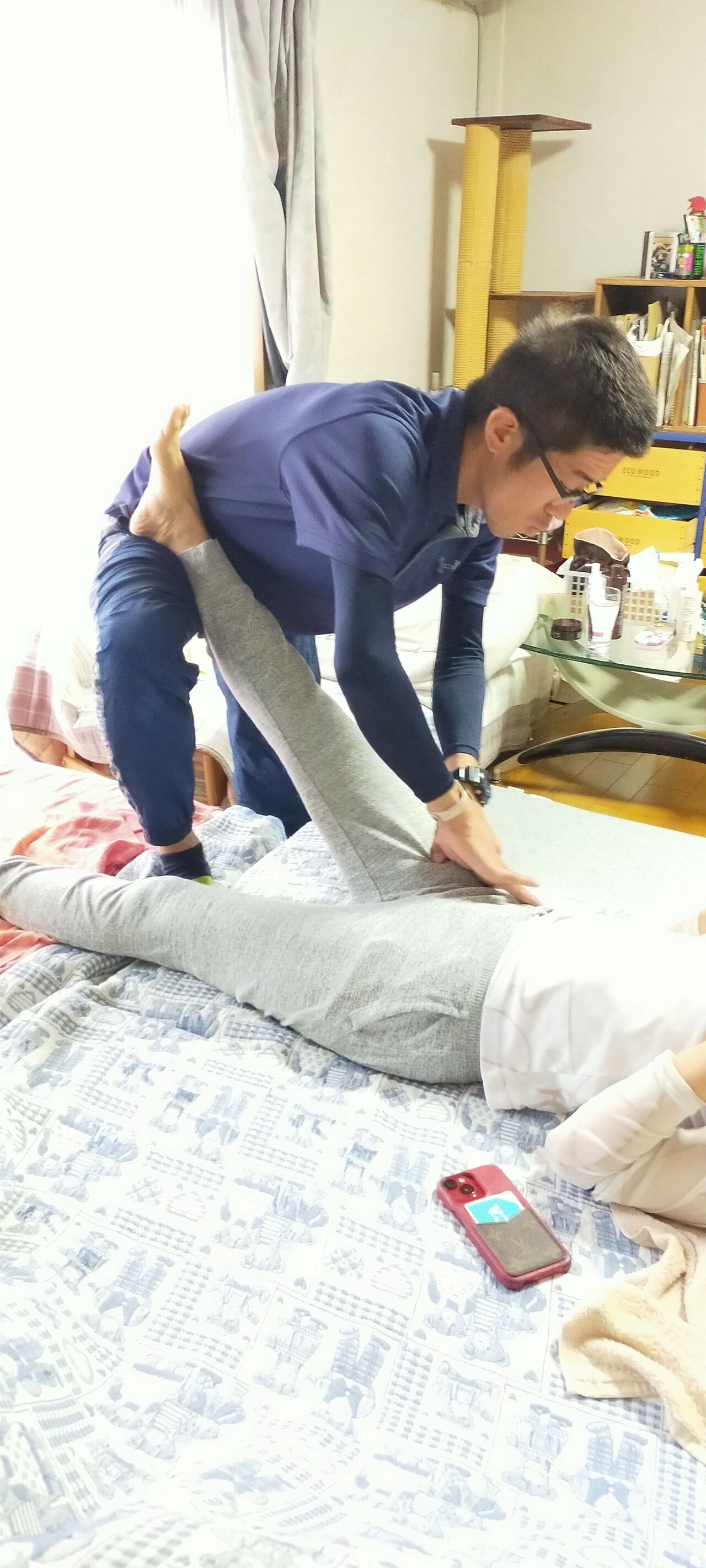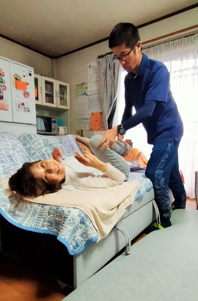 家の古いソファをベッド型に伸ばして、久保コーチの施術が始まりました