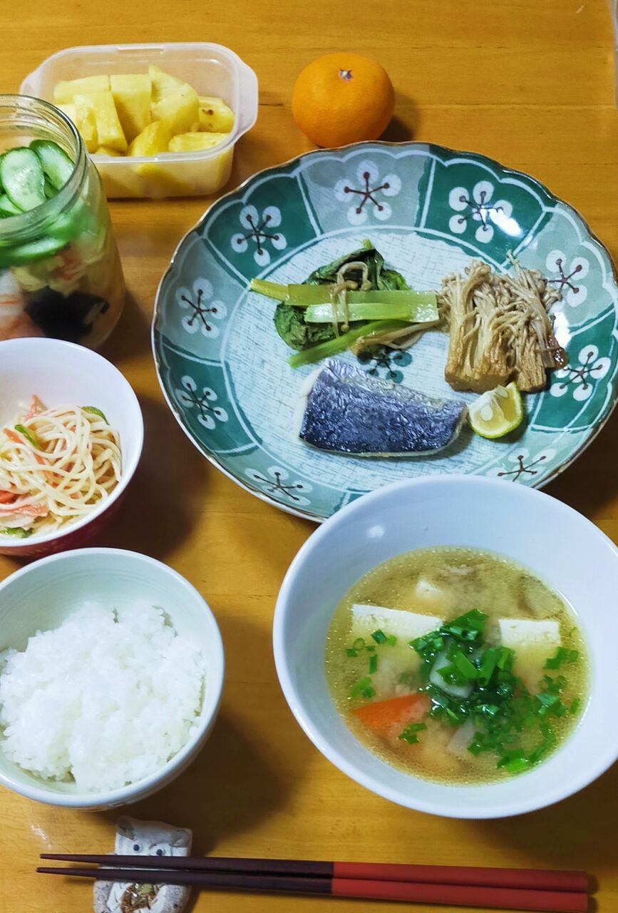 グリルで、鰆、エノキ、小松菜を太白胡麻油をかけ、塩少々で焼きました